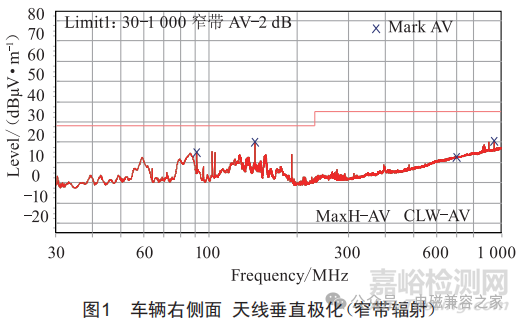 按照標(biāo)準(zhǔn)要求進(jìn)行窄帶輻射發(fā)射試驗(yàn),車輛狀態(tài)為上電且發(fā)動機(jī)不運(yùn)轉(zhuǎn),車輛開啟前后雨刮、雙閃、近光燈、前后霧燈、頂燈、空調(diào)等電氣設(shè)備,車門閉鎖,車窗關(guān)閉。測試通過,本文給出部分測試結(jié)果,如圖1所示。