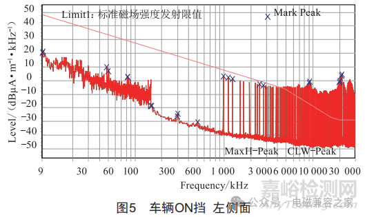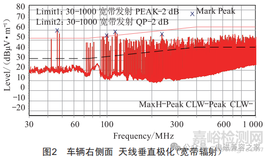 按照標(biāo)準(zhǔn)要求進(jìn)行寬帶輻射發(fā)射試驗(yàn),車輛狀態(tài)40km/h。測試未通過,圖2為測試結(jié)果。