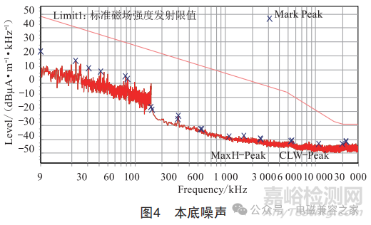 首先確認(rèn)試驗(yàn)室本底噪聲是否符合要求。為防止電波暗室的本底噪聲出現(xiàn)偶然現(xiàn)象,進(jìn)行多次重復(fù)測試,圖4為測試結(jié)果。由測試結(jié)果可得出電波暗室的本底噪聲合格,排除試驗(yàn)室因素。在此后查找中磁場天線極化均為與車輛平行方向。