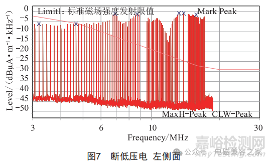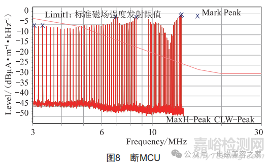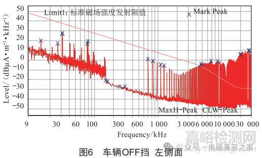 第一步:斷車輛低壓電,輪轂帶動車輛,速度40km/h,測試頻段3~30MHz,測試結(jié)果如圖7所示。