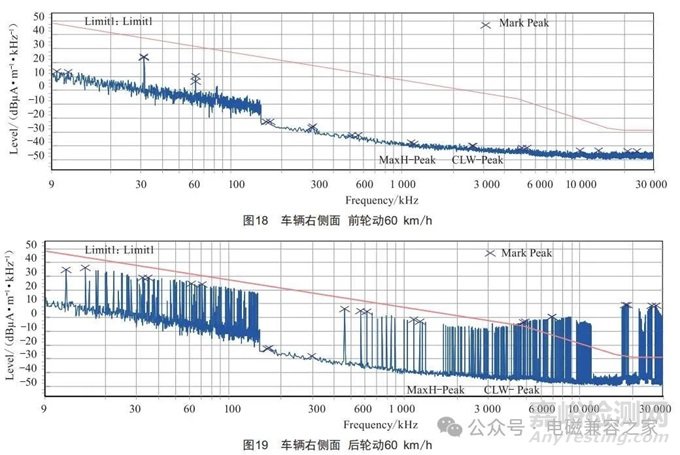 首先對電機(jī)進(jìn)行處理[2],拆三相、電機(jī)加屏蔽、三相蓋屏蔽、電機(jī)體搭鐵,轉(zhuǎn)轂帶動車輛,速度40km/h,車輛右側(cè)面測試結(jié)果如圖14所示。