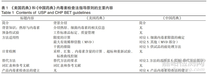 中國(guó)與美國(guó)內(nèi)毒素檢查法指導(dǎo)原則體例不同,因《美國(guó)藥典》相較《中國(guó)藥典》對(duì)應(yīng)條目更多,因此本文按照《美國(guó)藥典》的體例逐一展開(kāi),先介紹《美國(guó)藥典》的內(nèi)容,涉及到《中國(guó)藥典》內(nèi)容時(shí),在本條目中對(duì)比中國(guó)與美國(guó)藥典進(jìn)行介紹。