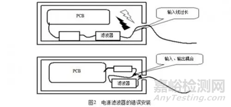 (3)在電源電路(尤其是開(kāi)關(guān)電源中),操縱電路,控制電路,以及轉(zhuǎn)換電路中消除產(chǎn)生的干擾。在工程實(shí)際中,一個(gè)最值得注意的地方是電源濾波器的安裝,常見(jiàn)的濾波器的錯(cuò)誤安裝如圖2所示。