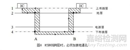 在布線時(shí)盡量少穿過(guò)孔,因?yàn)檫^(guò)孔阻抗和線阻抗不一樣,存在阻抗突變,從而產(chǎn)生駐波使信號(hào)變壞,容易形成輻射,尤其是在時(shí)鐘需要穿層時(shí),要做技術(shù)處理,時(shí)鐘線跨層時(shí)的處理如圖6所示。