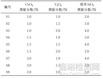 按照表1配料,將PF2123酚醛樹(shù)脂置于烘焙箱內(nèi)50~60℃下干燥0.5~1h,芳綸纖維、填料置于烘焙箱內(nèi)100~120℃下干燥1~2h。為研究稀土CeO2、Y2O3、納米SiO2添加量(質(zhì)量分?jǐn)?shù),下同)的影響,設(shè)計(jì)了三因素三水平的正交試驗(yàn),設(shè)計(jì)試驗(yàn)數(shù)為9組(見(jiàn)表2)。按照表2中的添加量(基礎(chǔ)原料總質(zhì)量分?jǐn)?shù)與改性材料總質(zhì)量分?jǐn)?shù)之和為1)稱(chēng)取改性材料在100~120℃下干燥1~2h。將芳綸纖維放進(jìn)JF830SJ+型混料機(jī)中攪拌10~20min,隨后加入其余材料繼續(xù)攪拌15min,倒入FC400TON型熱壓機(jī)模腔中進(jìn)行熱壓,模腔內(nèi)預(yù)刷上脫模劑, 預(yù)熱至150℃,壓力為18MPa,保壓時(shí)間10min,工作溫度為160℃,工作時(shí)間為15min,每隔15s排氣一次,共排3次,得到尺寸為1500mm×1000mm×1000mm的試樣。將熱壓成形后的試樣置于841Y型電熱鼓風(fēng)干燥箱中進(jìn)行熱處理,先以8 ℃ · min−1的升溫速率加熱至140℃保溫0.5h,再以5℃ · min−1的升溫速率加熱至160℃保溫0.5h,最后以5℃ · min−1的升溫速率加熱至180℃保溫1.5h,隨爐冷卻。