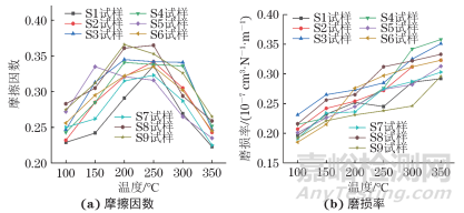 由圖3(a)可見(jiàn):隨著試驗(yàn)溫度在100~350℃內(nèi)升高,不同配比試樣的摩擦因數(shù)均呈現(xiàn)先增大后減小的變化趨勢(shì),且在中溫階段(200~250℃)達(dá)到最大值,溫度超過(guò)250℃后均明顯減小,表明高溫階段(300~350 ℃)試樣的摩擦性能顯著下降;在中溫階段試樣S3、S8、S9的平均摩擦因數(shù)較大,試樣S1、S5、S7的平均摩擦因數(shù)較小,250℃下試樣S8的摩擦因數(shù)最大,為0.365,而試樣S5的摩擦因數(shù)最小,為0.316。由圖3(b)可見(jiàn):隨著溫度升高,不同試樣的磨損率均整體呈逐漸增大的趨勢(shì),并且試樣S1、S7、S9的磨損率變化較平緩,試樣S3、S4、S8的磨損率變化波動(dòng)較大;在中溫階段,試樣S9的磨損率整體較小且穩(wěn)定,保持在0.231×10−7~0.238×10−7cm3·N−1 ·m−1范圍內(nèi),這是由于試樣S9中改性材料配比適宜,從而表現(xiàn)出更優(yōu)異的熱穩(wěn)定性。