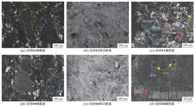圖4 試樣S1和S9的橫截面、剪切斷面和磨損面微觀(guān)形貌