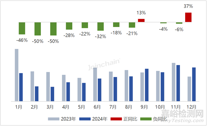從月度趨勢(shì)看,市場(chǎng)規(guī)模整體呈先降后升趨勢(shì)。1月至6月,同比均為負(fù)增長(zhǎng),且負(fù)增長(zhǎng)率相對(duì)較高,7月開始逐漸復(fù)蘇,并在年末達(dá)到較高增長(zhǎng)水平,12月同比增長(zhǎng)37%。