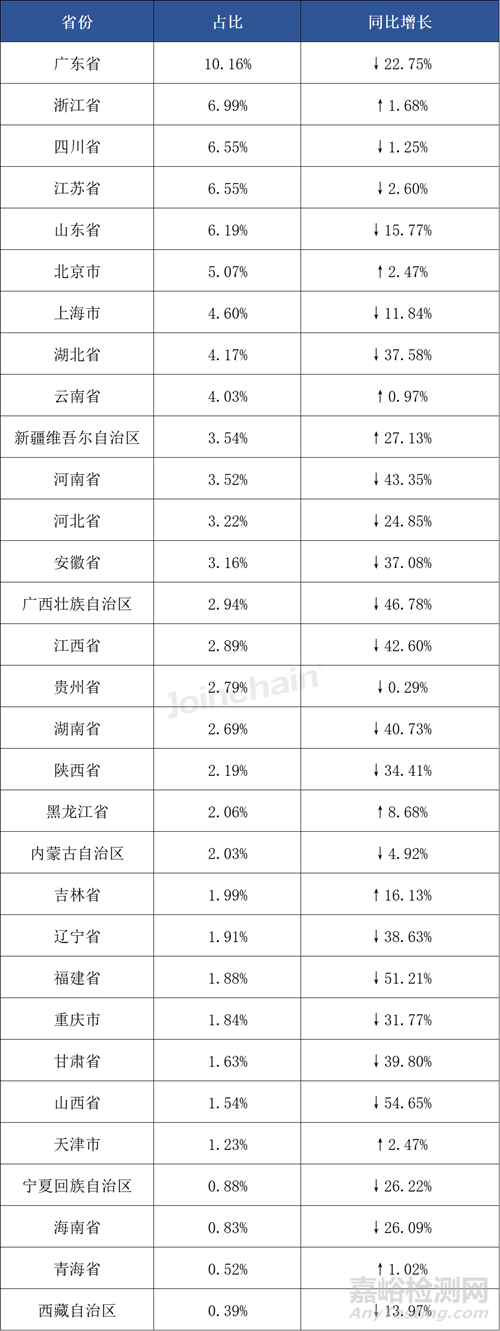 從省份采購(gòu)金額來(lái)看,廣東采購(gòu)規(guī)模最高,遠(yuǎn)高于其他省份,浙江、四川和江蘇采購(gòu)規(guī)模也相對(duì)較高。此外,與去年同期相比,僅有8個(gè)省份呈正增長(zhǎng),其中新疆和吉林同比增長(zhǎng)率相對(duì)較高,分別達(dá)到了27%和16%。