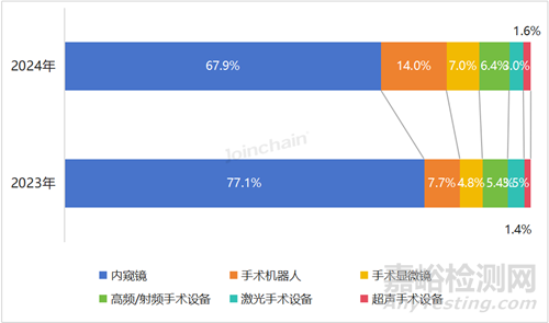2024年(截至12月20日),我國(guó)外科手術(shù)設(shè)備公開招中標(biāo)市場(chǎng)規(guī)模與去年同期相比出現(xiàn)更大幅度的下滑,同比下降了18.0%。從細(xì)分產(chǎn)品來(lái)看,內(nèi)窺鏡作為外科手術(shù)設(shè)備市場(chǎng)中的主導(dǎo)產(chǎn)品,2024年市場(chǎng)規(guī)模占比顯著下降,下降幅度超9%;手術(shù)機(jī)器人、手術(shù)顯微鏡和高頻/射頻手術(shù)設(shè)備市場(chǎng)規(guī)模占比均呈上升趨勢(shì),其中手術(shù)機(jī)器人增長(zhǎng)幅度超6%;激光手術(shù)設(shè)備和超聲手術(shù)設(shè)備市場(chǎng)規(guī)模占比相對(duì)穩(wěn)定。