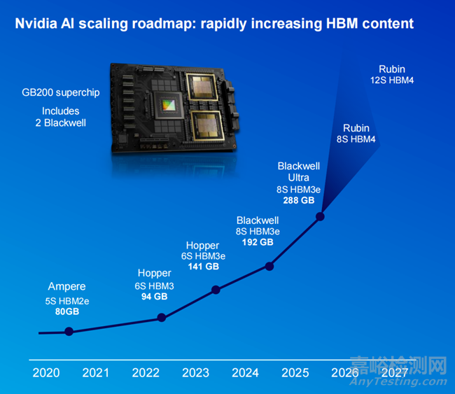 1)近年來,HBM憑借高帶寬、低延遲和高能效等特點(diǎn),成為AI芯片標(biāo)配。如下圖所示,自2020年以來,Nvidia的AI芯片逐步提升HBM的配置,從Ampere芯片的5片HBM2e(80GB)逐步擴(kuò)展到2027年預(yù)期的Rubin芯片,配備12片HBM4。