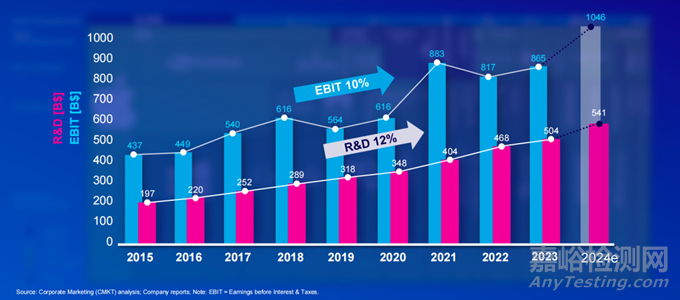 2015年到2024年(預(yù)測(cè)值)的研發(fā)支出和息稅前利潤(rùn)的變化趨勢(shì)。