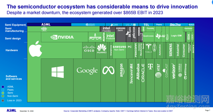 盡管市場(chǎng)低迷,但在2023年該生態(tài)系統(tǒng)仍創(chuàng)造了超過8650億美元的息稅前利潤(rùn)(EBIT)。預(yù)計(jì)2024年半導(dǎo)體行業(yè)的EBIT將達(dá)到10460億美元,而研發(fā)支出將達(dá)到5410億美元。半導(dǎo)體生態(tài)系統(tǒng)已經(jīng)將大約一半的息稅前利潤(rùn)用于推動(dòng)長(zhǎng)期創(chuàng)新和增長(zhǎng),ASML預(yù)計(jì)這一趨勢(shì)將繼續(xù)下去。足見半導(dǎo)體生態(tài)系統(tǒng)具有強(qiáng)大的推動(dòng)創(chuàng)新的能力。