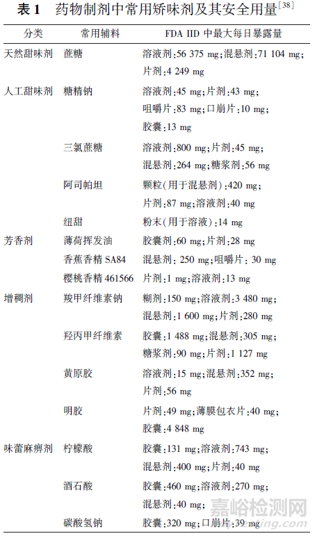 其中,矯掩味用輔料是兒童口服制劑中重要的組成部分。由于兒童對(duì)藥物的味道敏感,難以接受苦澀或難聞的味道,輔料的選擇對(duì)于改善兒童用藥的口感和接受度具有關(guān)鍵作用。兒科口服制劑常用的矯味劑主要有甜味劑、芳香劑、增稠劑以及味覺麻痹劑。矯味劑通過不同掩味機(jī)制改善藥物口感:甜味劑和芳香劑的掩味原理在于混淆大腦對(duì)味覺的感受[37];增稠劑通過其黏稠緩和的性質(zhì)控制藥物擴(kuò)散,從而干擾味覺細(xì)胞的感知進(jìn)行矯味;味蕾麻痹劑則利用碳酸氫鹽與有機(jī)酸產(chǎn)生的二氧化碳來麻痹味蕾達(dá)到掩味。通過查詢美國(guó)FDA的非活性成分?jǐn)?shù)據(jù)庫(IID),獲取藥物制劑中常用矯味劑的輔料安全性信息,截至2024年1月的最大每日暴露量(MDE)總結(jié)詳見表1。