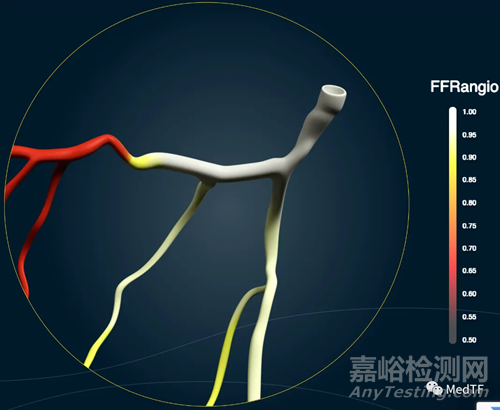 FFRangio是另一種基于冠狀動(dòng)脈造影衍生的FFR技術(shù),它可以使用血管造影在心外膜的任何位置生成一個(gè)完整的三維冠狀動(dòng)脈樹。隨后進(jìn)行血流動(dòng)力學(xué)評(píng)估,根據(jù)血管的長(zhǎng)度和直徑估計(jì)血管阻力,并且通過(guò)評(píng)估微循環(huán)床阻力估計(jì)正常的最大血流量,然后評(píng)估狹窄和“健康”冠狀樹的流量比率,最后生成一個(gè)有顏色的映射網(wǎng)格并顯示每個(gè)位置的FFR值。