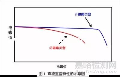 與此同時(shí),"基于電感值的變化率的額定電流"是以電感值的下降程度為指標(biāo)的額定電流規(guī)定,超出該范圍使用時(shí)可能會(huì)由于紋波電流的增加而導(dǎo)致IC控制不穩(wěn)定。此外,根據(jù)電感器的磁路構(gòu)造的不同,磁飽和的傾向(即電感值的下降傾向)有所不同。圖1是表示不同磁路構(gòu)造所導(dǎo)致的電感值的變化的示意圖。對(duì)于開磁路類型,隨著直流電流的增加,到規(guī)定電流值為止呈現(xiàn)比較平坦的電感值,但以規(guī)定電流值為境界電感值急劇下降。相反,閉磁路類型隨著直流電流的增加,透磁率的數(shù)值逐漸減少,因此電感值緩慢下降。
