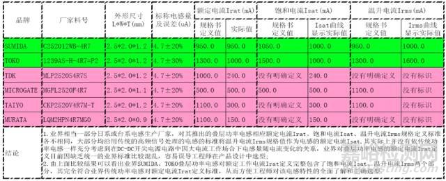 以下是以2520系列中的4.7uH疊層功率電感為例對(duì)比說明業(yè)界目前對(duì)電感器額定電流Irat、飽和電流Isat以及溫升電流Irms標(biāo)識(shí)狀況。