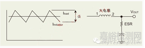 從下圖可以看出,流過開關(guān)電源電感器的電流由交流和直流兩種分量組成,因?yàn)榻涣鞣至烤哂休^高的頻率,所以它會(huì)通過輸出電容流入地,產(chǎn)生相應(yīng)的輸出紋波電壓dv=di×RESR。這個(gè)紋波電壓應(yīng)盡可能低,以免影響電源系統(tǒng)的正常操作,一般要求峰峰值為10mV~500mV。