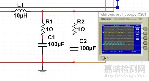如果我們用2個(gè)1Ω,100uF的電容,則會(huì)發(fā)現(xiàn)紋波電壓進(jìn)一步減小。一方面是電容在開關(guān)頻率點(diǎn)的阻抗通過并聯(lián)進(jìn)一步減小,另一方面,ESR其實(shí)也是等效于并聯(lián)。本質(zhì)是ESR與電容串聯(lián)后并聯(lián),導(dǎo)致輸出電容在開關(guān)頻率點(diǎn)上的阻抗明顯減小。
