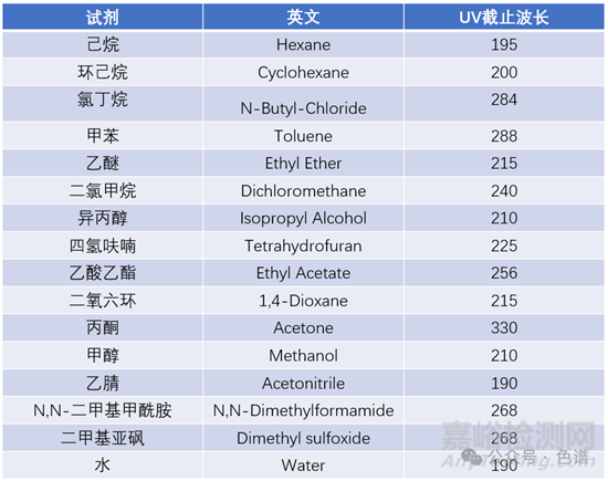 下面是一些常用試劑的紫外截止波長(zhǎng):