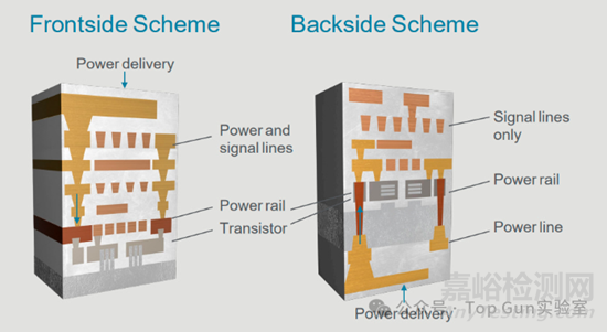 先簡單上個圖,來對比下傳統(tǒng)正面供電和晶背供電芯片的結(jié)構(gòu)差異。顧名思義,正面供電就是將電源通過正面頂層金屬將電源輸入通過金屬過孔傳遞到晶體管;晶背供電是將電源通過背面金屬直接傳遞到晶體管或通過M1金屬層傳遞到晶體管。