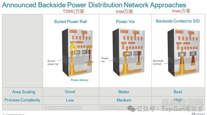 1)PowerVia于2024年上半年在Intel 20A制程節(jié)點(diǎn)上推出,通過背面電源分配網(wǎng)絡(luò)(BS-PDN)將電源線移至晶圓背面,解決芯片單位面積微縮中日益嚴(yán)重的互連瓶頸問題。