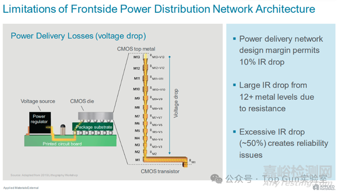 隨著器件的微縮,金屬過孔和金屬層也等比例進(jìn)行微縮,因此金屬層疊加會產(chǎn)生電阻造成電壓降,而層數(shù)越多,電阻越高,這就使得電壓降的情況更嚴(yán)重。在半導(dǎo)體中,這些底層結(jié)構(gòu)對于最關(guān)鍵的晶體管層的整體設(shè)計來說是必不可少的。所以,我們不能再在晶圓正面構(gòu)建大量的層疊結(jié)構(gòu)了。