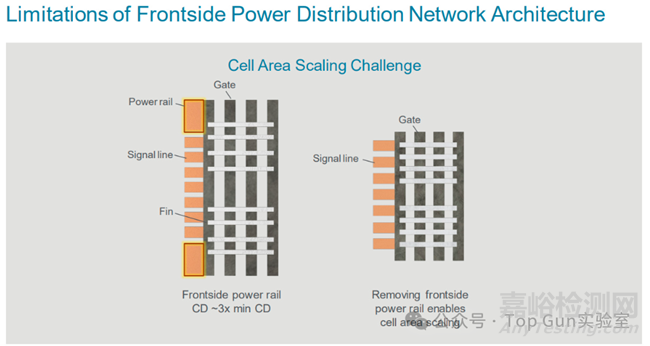 背面電源分配網(wǎng)絡(luò)(Backside Power Delivery Network)是一種很巧妙的方法,它將信號層和電源層分開,更大程度地縮小晶體管的尺寸。下面是一個關(guān)于背面電源分配網(wǎng)絡(luò)(BS-PDN)如何縮小結(jié)構(gòu)尺寸的例子。