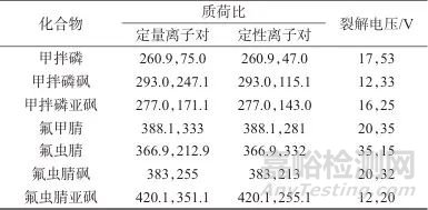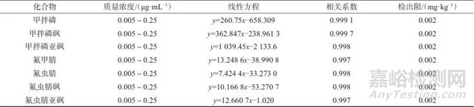混合標(biāo)準(zhǔn)溶液:精密量取甲拌磷、甲拌磷砜、甲拌磷亞砜、氟甲腈、氟蟲腈、氟蟲腈砜、氟蟲腈亞砜農(nóng)藥標(biāo)準(zhǔn)溶液1 mL,置于20 mL容量瓶中,用乙腈稀釋至標(biāo)線,搖勻即得混合標(biāo)準(zhǔn)溶液。