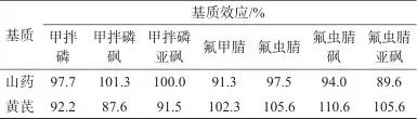 中藥樣品中存在大量天然化合物,如多酚類物質(zhì)、黃酮類物質(zhì)等中存在的其他化學(xué)物質(zhì)和蛋白質(zhì)、多糖等高分子物質(zhì)[15?16],這些化學(xué)物質(zhì)可能會干擾農(nóng)藥殘留的提取、凈化和檢測過程,導(dǎo)致檢測結(jié)果出現(xiàn)誤差。分別選取經(jīng)過全自動QuEChERS實(shí)驗(yàn)儀處理后的山藥、黃芪基質(zhì)加標(biāo)混合標(biāo)準(zhǔn)溶液和溶劑配制的混合標(biāo)準(zhǔn)溶液,分別進(jìn)樣,比較農(nóng)藥目標(biāo)物質(zhì)的影響,并以通過樣品溶液與混合標(biāo)準(zhǔn)溶液色譜峰面積比值表示基質(zhì)效應(yīng)因子,結(jié)果見表3?;|(zhì)效應(yīng)因子值越接近100%,表明基質(zhì)效應(yīng)越低。