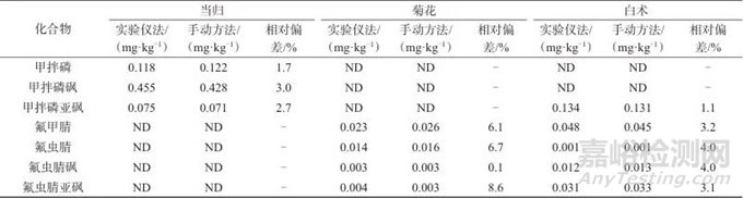 為進(jìn)一步驗(yàn)證通過式全自動QuEChERS實(shí)驗(yàn)儀處理方法的準(zhǔn)確性,分別采用手動方法和該方法進(jìn)行對比實(shí)驗(yàn)。對比實(shí)驗(yàn)選取了當(dāng)歸、菊花和白術(shù)3種不同的陽性中藥材樣品進(jìn)行檢測,結(jié)果見表6。由表6可見,該方法檢測結(jié)果與手動方法檢測結(jié)果之間無明顯差異,說明兩種方法的一致性較好。