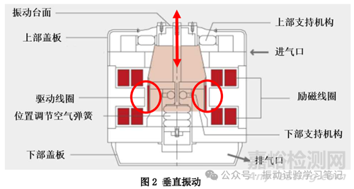 圖2 垂直振動,上下支持機構保證振動臺面在豎直方向振動(圖中紅色箭頭),與其振動方向垂直的平面上基本沒有振動偏量。但是當上部支持機構或下部支持機構松動磨耗損壞的話(圖3),就會導致驅動線圈和短路環(huán)接觸(紅色圓圈處),出現(xiàn)損壞。