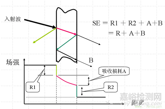 電磁波入射到無(wú)限大的平板型屏蔽體時(shí),一部分能量被反射,稱反射損耗,記為R1;透射波在金屬板內(nèi)傳播時(shí)被衰減,稱吸收損耗,記為A.電磁波到達(dá)屏蔽體另一側(cè)時(shí),又被反射記為R2,僅有小部分能量透射進(jìn)入被屏蔽空間。被反射的能量又被衰減和反射,循環(huán)往復(fù),直至能量全部被衰減和透射。這種多次反射的現(xiàn)象,稱多次反射修正系數(shù),記為B,量值小于1.