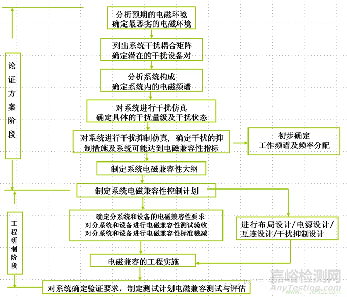 EMC對(duì)系統(tǒng)效能的影響包括:系統(tǒng)性能降低或失效;系統(tǒng)可靠性降低;影響系統(tǒng)工作壽命;影響效/費(fèi)比的權(quán)衡;影響系統(tǒng)和人員的生存性和安全性;延誤生產(chǎn)和使用。系統(tǒng)級(jí)電磁兼容設(shè)計(jì)流程如圖13所示。