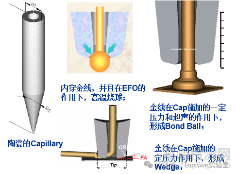 a)Capillary(陶瓷劈刀):W/B工藝中最核心的一個(gè)Bonding Tool,內(nèi)部為空心,中間穿上金線,并分別在芯片的Pad和Lead Frame的Lead上形成第一和第二焊點(diǎn);