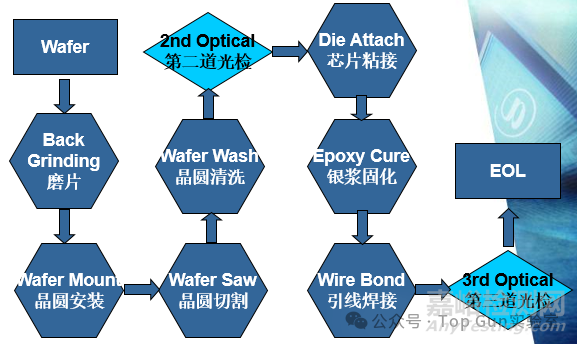 目前,主流的Wafer Saw設(shè)備都具有CCD檢查功能,可以在切割的同時(shí)檢查是否有產(chǎn)生切割缺陷,第二道光檢主要目的是針對Wafer Saw之后在顯微鏡下進(jìn)行Wafer的外觀抽檢,檢查是否有出現(xiàn)廢品,常見的缺陷為Die chipping(芯片崩邊)。