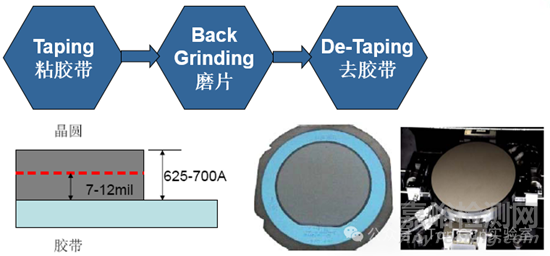 將從晶圓廠出來的Wafer進(jìn)行背面研磨,來減薄晶圓達(dá)到封裝需要的厚度(8mils~10mils);磨片時(shí),需要在正面(Active Area)貼膠帶保護(hù)電路區(qū)域,同時(shí)研磨背面;研磨之后,去除膠帶,測量厚度。