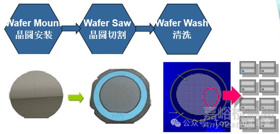 將晶圓粘貼在藍(lán)膜(Mylar)上,使得即使被切割開后,不會散落;通過Saw Blade將整片Wafer切割成一個(gè)個(gè)獨(dú)立的Dice,方便后面的Die Attach等工序;Wafer Wash主要清洗Saw時(shí)候產(chǎn)生的各種粉塵,清潔Wafer。