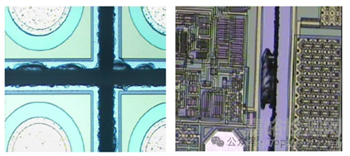 第三道光檢主要目的是針對Wafer Saw之后在顯微鏡下進(jìn)行Wafer的外觀抽檢,檢查是否有出現(xiàn)廢品。典型缺陷如下圖所示,相鄰鍵合絲搭接短路。
