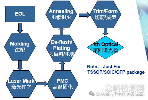 6)Final visual inspection:在低倍放大鏡下,對產(chǎn)品外觀進(jìn)行檢查。主要針對EOL工藝可能產(chǎn)生的廢品:例如Molding缺陷,電鍍?nèi)毕莺蚑rim/Form缺陷等。