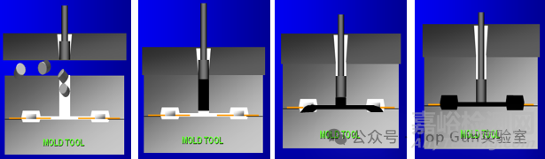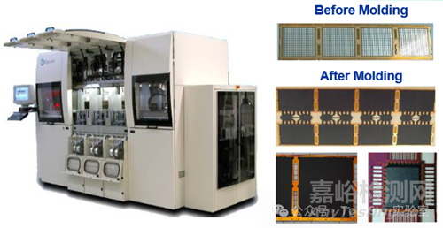 1)注塑(Molding):為了防止外部環(huán)境的沖擊,利用塑封料把Wire Bonding完成后的產(chǎn)品封裝起來的過程,并加熱硬化。