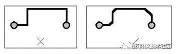 為降低EMI,應(yīng)避免走線、過孔及其它元器件形成90°角,因?yàn)橹苯菚?huì)產(chǎn)生輻射。在該角處電容會(huì)增加,特性阻抗也會(huì)發(fā)生變化,導(dǎo)致反射,繼而引起EMI。要避免90°角,走線應(yīng)至少以兩個(gè)45°角布線到拐角處。