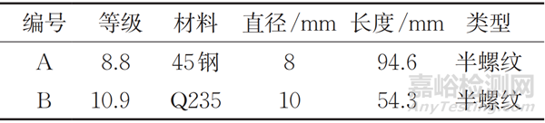 拉伸機(jī)集成了壓力傳感器,工控機(jī)可以通過RS232串口與拉伸試驗(yàn)機(jī)控制盒進(jìn)行通信,實(shí)現(xiàn)拉伸試驗(yàn)機(jī)動(dòng)作以及壓力傳感器讀數(shù)。選取不同規(guī)格的兩顆螺栓作為試驗(yàn)對(duì)象,螺栓試件實(shí)物及其詳細(xì)參數(shù)如圖4所示。