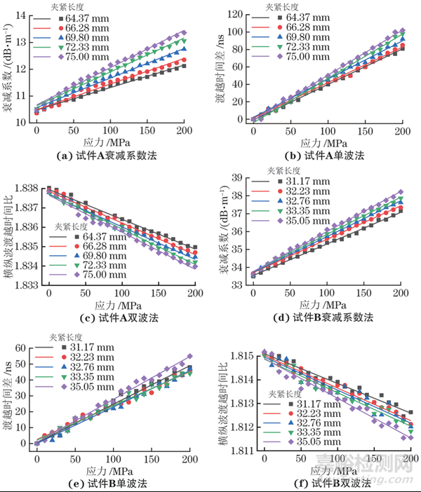 首先使用拉伸機(jī)對(duì)試件A和B施加0~200 MPa的載荷,加載步長為10 MPa。兩顆不同長度和強(qiáng)度等級(jí)的試件在不同夾緊長度下,分別使用衰減系數(shù)法、單波法以及雙波法得到的標(biāo)定數(shù)據(jù)和擬合結(jié)果如圖5所示。