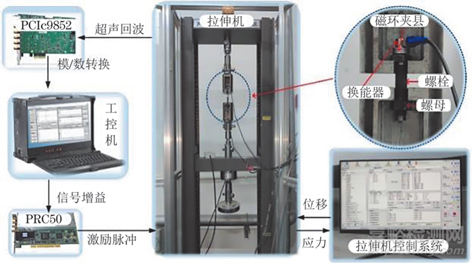 試驗(yàn)系統(tǒng)構(gòu)成如圖3所示,主要包括拉伸試驗(yàn)機(jī)、超聲換能器、超聲脈沖發(fā)射卡、脈沖發(fā)射和數(shù)據(jù)采集卡、工控機(jī)。