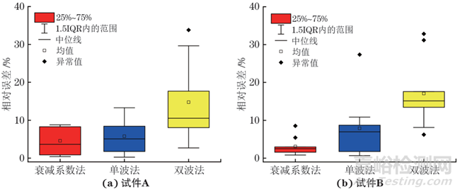 3種方法相對(duì)測(cè)量誤差的箱線圖如圖6所示,圖中IQR為四分位距,該圖直觀地展示了衰減系數(shù)法、單波法、雙波法的應(yīng)力評(píng)估效果以及穩(wěn)定性。