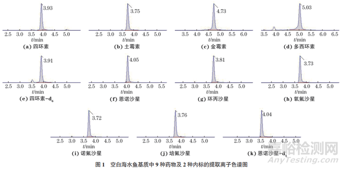 試驗比較了分別以水-乙腈、5mmol·L−1乙酸銨溶液-乙腈、0.1%甲酸溶液-乙腈體系作流動相時目標物的峰形及響應情況,根據(jù)試驗結果,選擇0.1%甲酸溶液-乙腈體系作流動相。在優(yōu)化的色譜條件下,加標空白海水魚基質溶液的提取離子色譜圖見圖1。