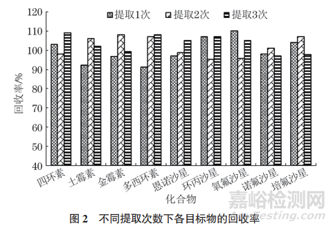 由圖2可知,不同提取次數(shù)下回收率均在90.0%~110%內(nèi)。為節(jié)省分析時間,試驗選擇只提取1次。