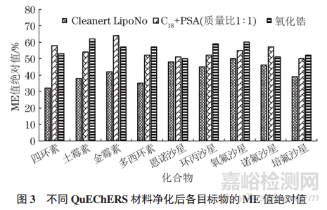 在日常監(jiān)督抽樣檢測中發(fā)現(xiàn),液液萃取法對試驗人員的操作能力要求較高,且耗費時間過長;固相萃取法需要專門的固相萃取裝置,凈化過程包括固相萃取柱活化以及樣品提取液上樣、淋洗、洗脫、收集等步驟,操作繁雜、耗時較長,且容易發(fā)生固相萃取柱堵塞等問題。因此,試驗選擇采用QuEChERS凈化樣品,并比較了分別采用凈化材料Cleanert LipoNo、C18+N-丙基乙二胺(PSA)(質量比 1∶1)、氧化鋯吸附脂類等非極性干擾物(用量均為1g)時加標空白基質(加標量5μg·kg−1)中各目標物的基質效應(ME)值(外標法所得ME值絕對值,分別采用空白基質溶液和初始流動相配制混合標準溶液系列并制作標準曲線,以前后二者標準曲線斜率比和 1 的差值的絕對值計算),結果見圖3。