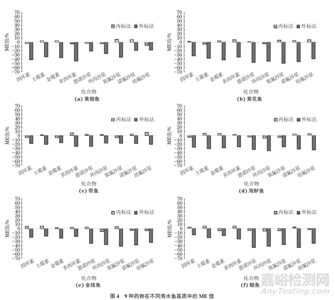 采用超高效液相色譜-串聯(lián)質譜法分析動物源性食品時,由于樣品基質往往會對定量結果產(chǎn)生嚴重影響,因此需要對基質效應進行評估。參考文獻計算ME值,當ME值絕對值不大于10%時,基質效應可以忽略;當ME值絕對值在 [10%,50%)內(nèi)時,存在中等基質增強或抑制效應;當ME值絕對值大于50%時,存在強基質增強或抑制效應,對定量結果影響較大。當存在中等或強基質效應時,需要優(yōu)化檢測方法,將ME值絕對值控制在10%以內(nèi)。目前消除基質效應的方法主要有空白基質匹配標準曲線法和內(nèi)標法。在實際檢測中,樣品基質種類多樣,不同基質對同一目標物產(chǎn)生的基質效應差異較大,若每種基質都用來制作空白基質匹配標準曲線,則所需空白基質數(shù)量龐大,經(jīng)濟及操作上均難以實現(xiàn)。同位素內(nèi)標法不僅準確度高、操作簡單,且無需制作空白基質匹配標準曲線;在同一類型藥物中選取1~2種同位素內(nèi)標直接進行內(nèi)標法定量分析,既兼顧了經(jīng)濟性又能確保方法的準確度。綜合考慮,試驗選擇采用四環(huán)素-d6作為四環(huán)素類藥物的同位素內(nèi)標,恩諾沙星-d5作為喹諾酮類藥物的同位素內(nèi)標,并以市場銷售量較高的6種空白海水魚基質(黃花魚、黃翅魚、帶魚、海鱸魚、金線魚和鯧魚,其中黃花魚及黃翅魚中目標物檢出率較高)為待測對象,考察了分別采用內(nèi)標法與外標法測定時各目標物的ME值,所得結果見圖4。